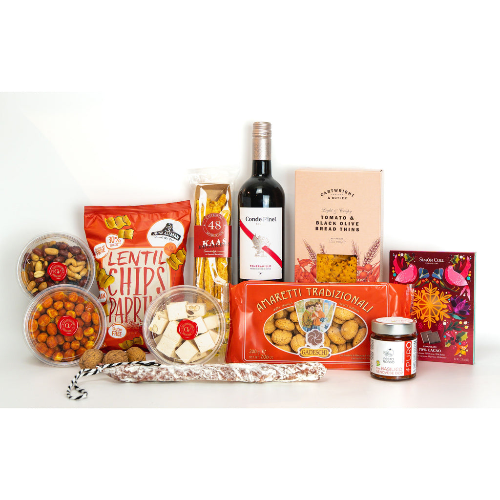 Een warm, smaakvol kerstpakket dat uitnodigt tot gezellig samen genieten. Perfect voor een feestelijke borrel of een knus avondje thuis. Dit pakket combineert hartige delicatessen, verfijnde snacks en een mooie rode wijn. Een kerstpakket dat altijd in de smaak valt.